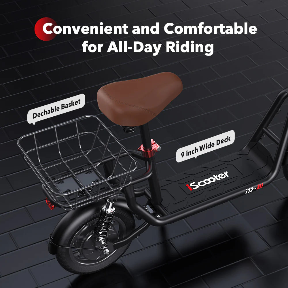 La trottinette iScooter i12 est un modéle spécialement conçu pour les trajets du quotidien, doté d'un panier et d'un siège ergonomique